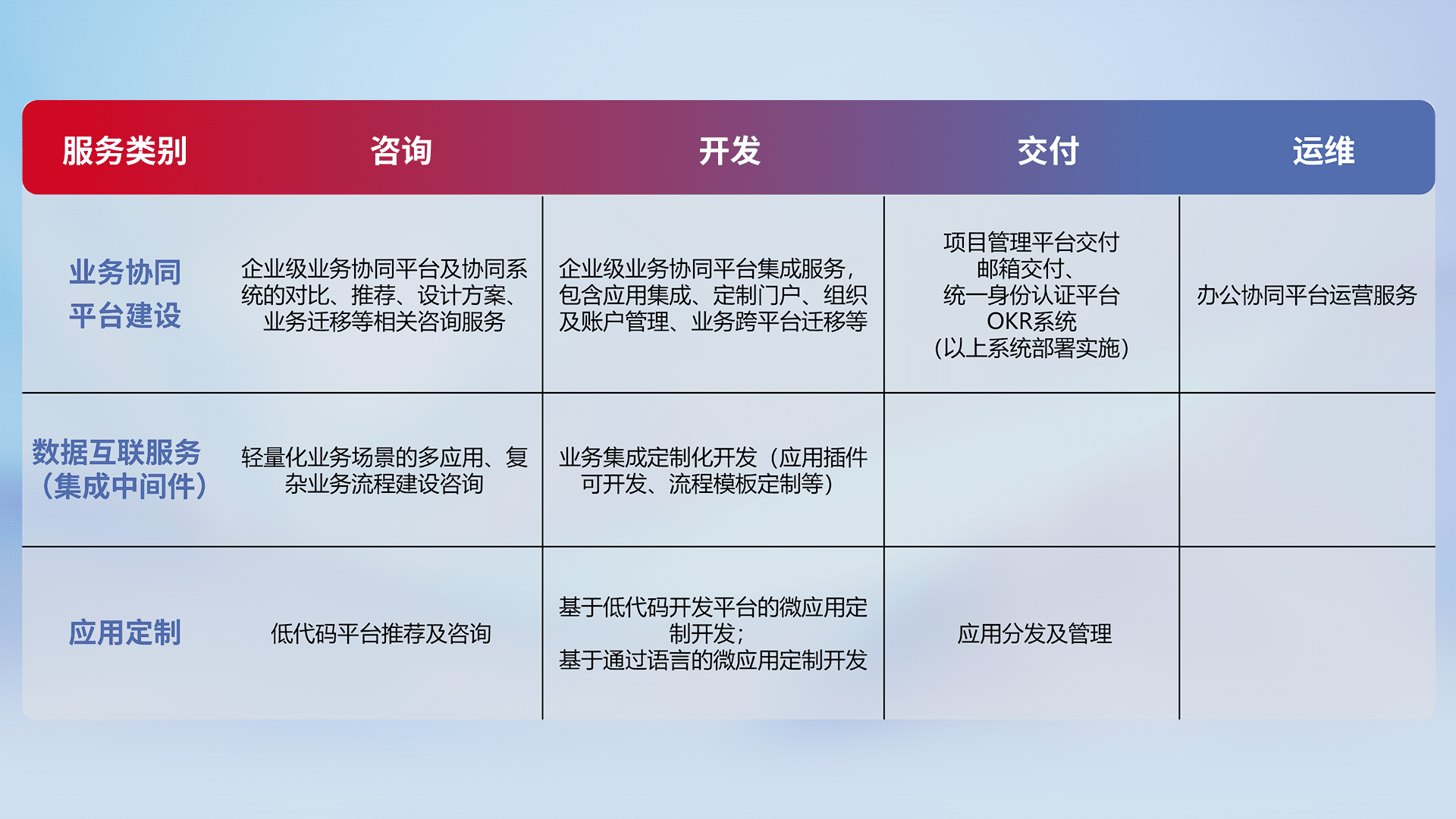 针对钉钉、、企微、、、IDaas等平台级产品提供产品的规划、、、方案、、、、交付、、定制化开发等服务,,,实现如统一协同办公、、智能客户服务、、、、混合会议管理、、、智能数据查询、、、、等业务场景,,,,实现数字化转型。。