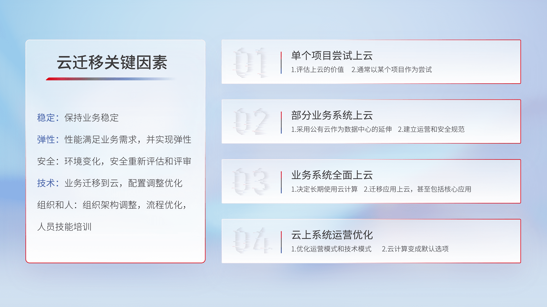 结合实际业务,,,,从规划设计、、云平台选型、、、、云原生改造、、、、数据迁移、、、集成交付,,,迁移全过程为客户识别最佳上云路径,,做好风险识别管理,,,设计网络架构、、、、身份权限、、、、安全审计合规、、、、操作审计、、日志审计、、、、监控告警策略、、多站点容灾设计等,,,对云上基础设施进行整体规划,,,,提升IT治理水平,,以满足弹性、、、高可用、、、、高性能的需求。。。