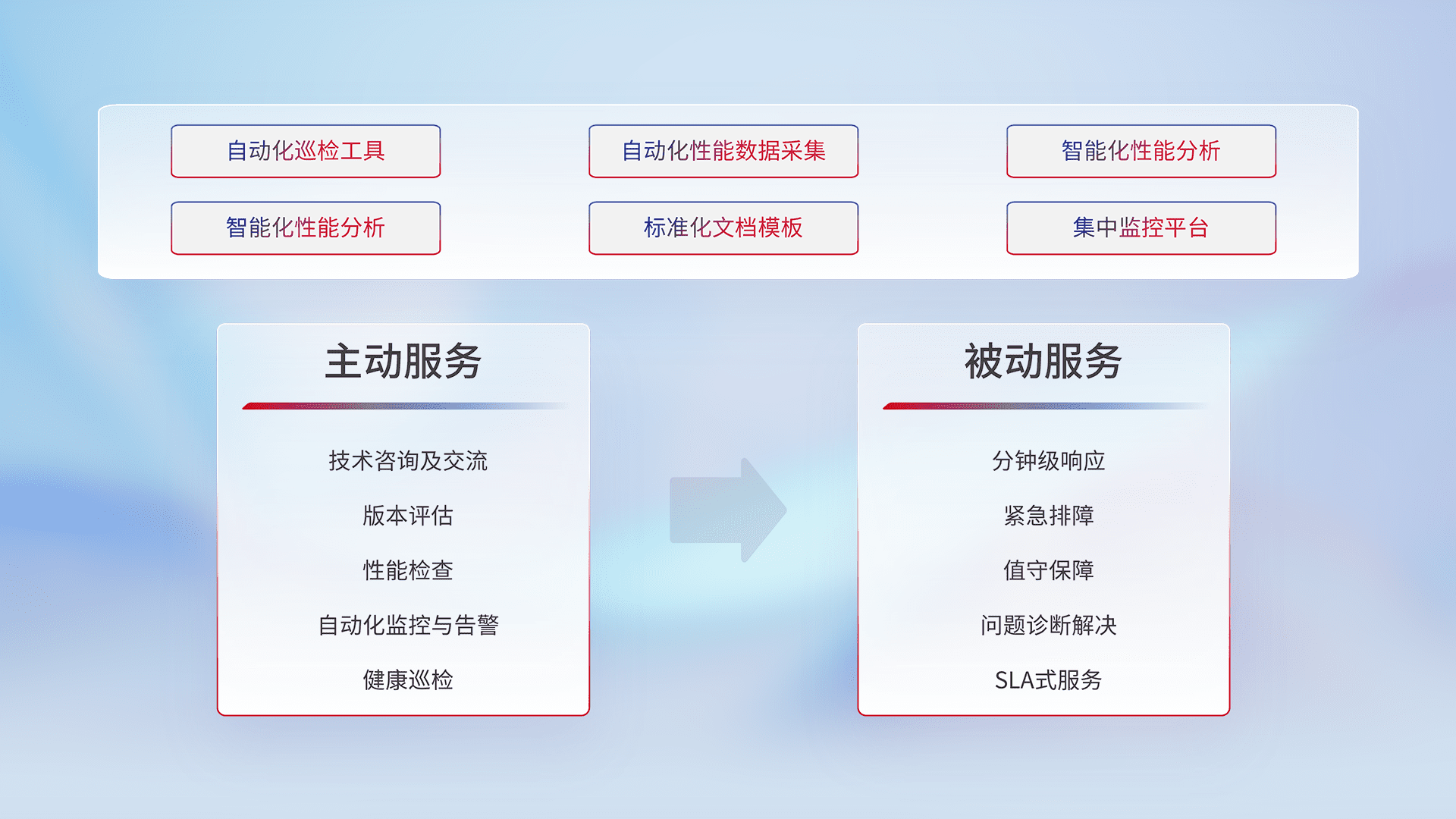 智能化工具和标准化文档,,,保障服务质量,,,,提供主动服务(包含技术咨询、、、、版本评估、、、性能检查、、自动化监控与告警、、、健康巡检)和被动服务包含(分钟级响应、、紧急排障、、值守保障、、、、问题诊断解决、、、SLA服务)。。。